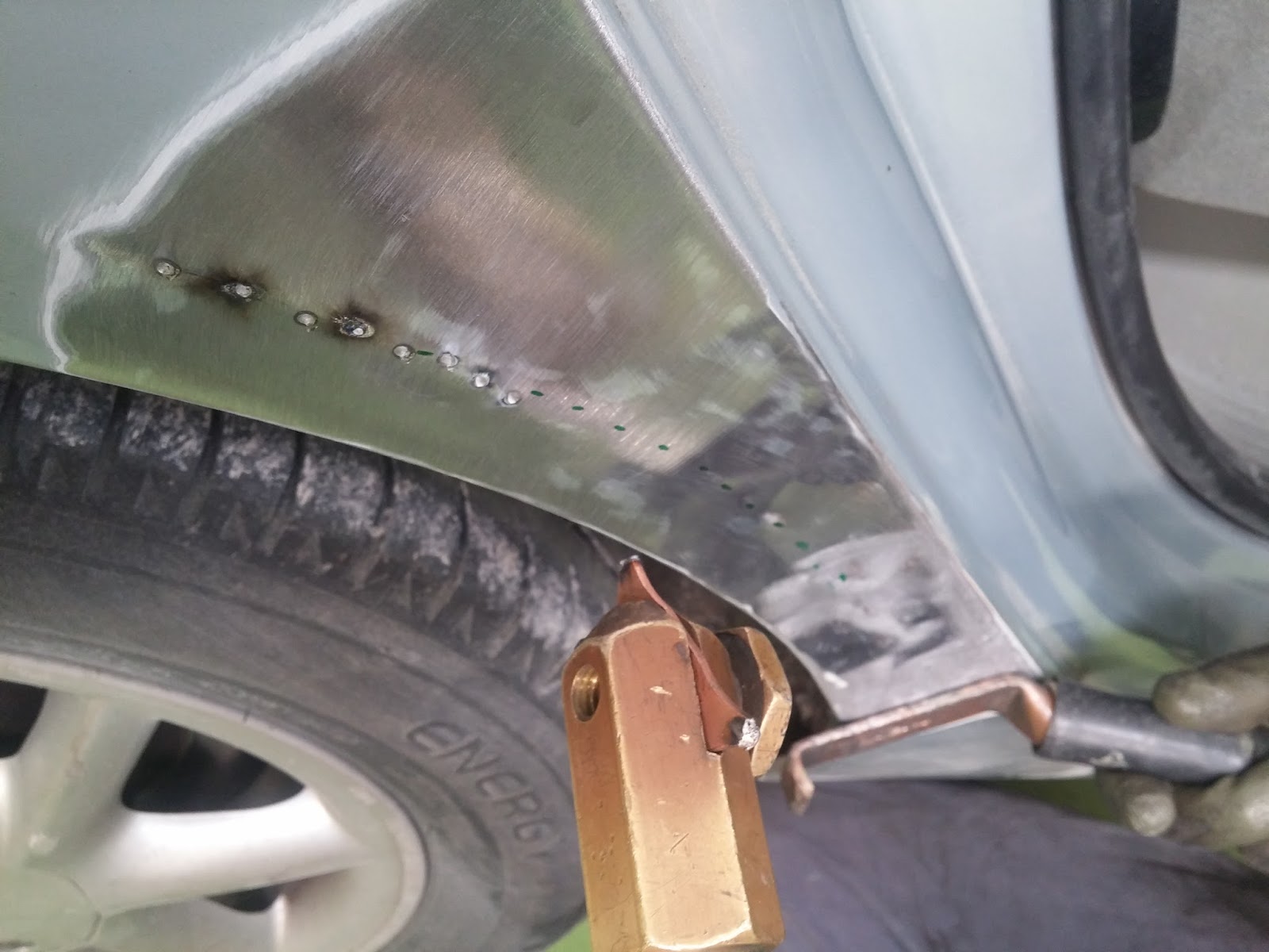 Después de esta un rato lijando la zona , nos hemos dando cuenta que la zona ya tenia masilla , así que el coche ya ha tenido un golpe un la misma zona , eso podría significar que la chapa en esa zona puede estar mas débil así que habrá que tener mas cuidado.